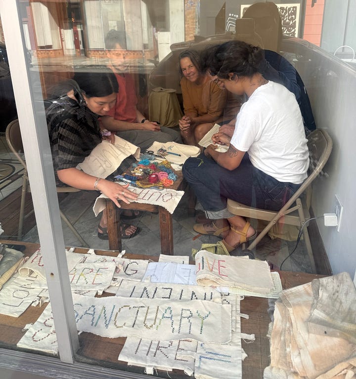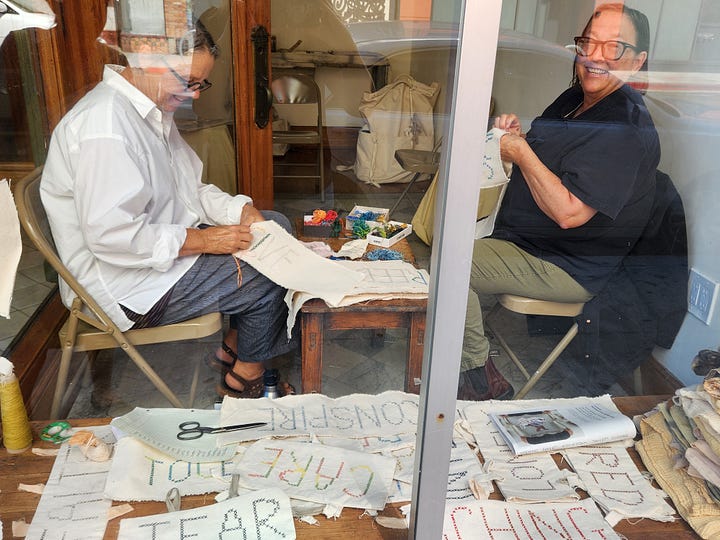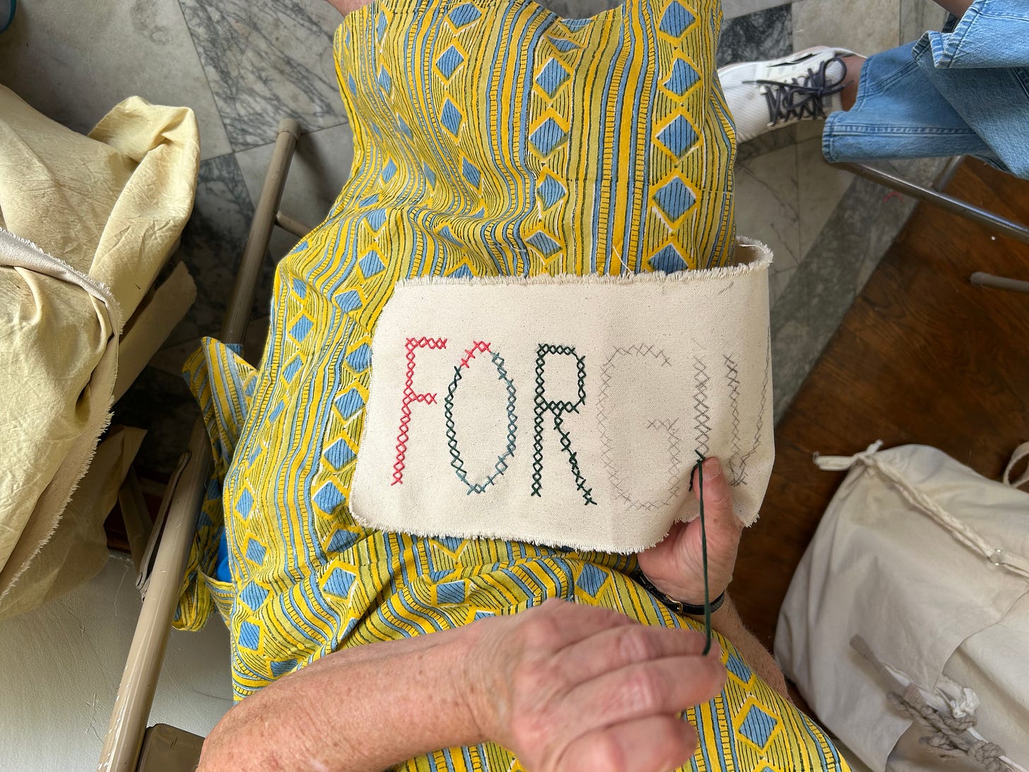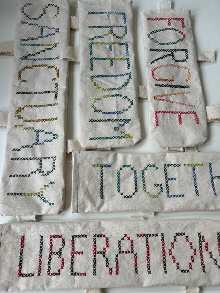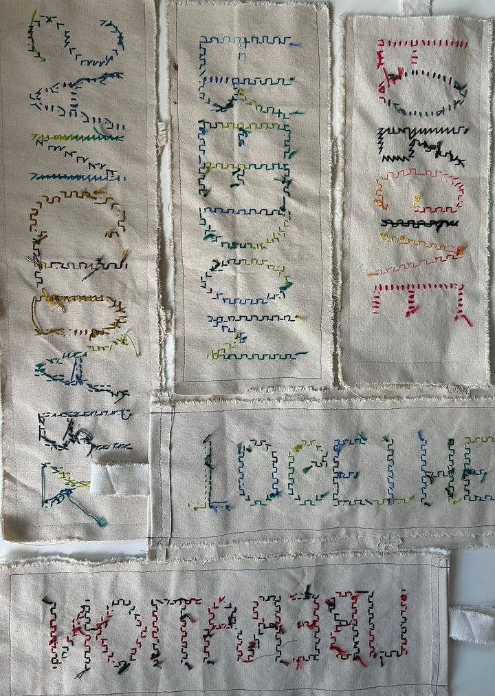 Many of us hold a yearning for those days and the moments sitting quietly, piercing the material, pulling the thread, repeating the feature of piercing and pulling until eventually knotting while a conversation began to simmer. Some of us talked about days before technological distractions, recalling how time was spent differently. Others enjoyed the simple break, enjoyed pattern making, the shape of the letter and the shifting colors of thread.