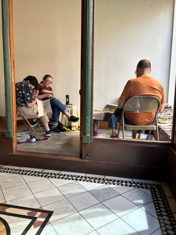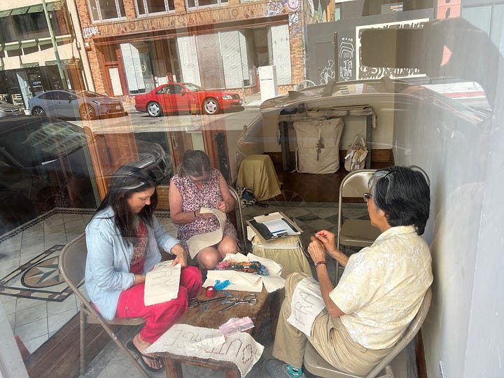 Encounters take many shapes. Sitting with folks stitching while stories slowly begin to emerge, the stories of who taught us to stitch and the things that were made to keep, to use or to pass along. The Mothers, Aunties and Grandmothers began with a simple border stitch than added more complicated ones desired for flower motifs. Sometimes it was through a summer camp or girl scouts that projects and techniques were shared. Today it is most often a social media post and a you tube video or an online course. All methods are good however, some lack the delicious spaces for conversations.