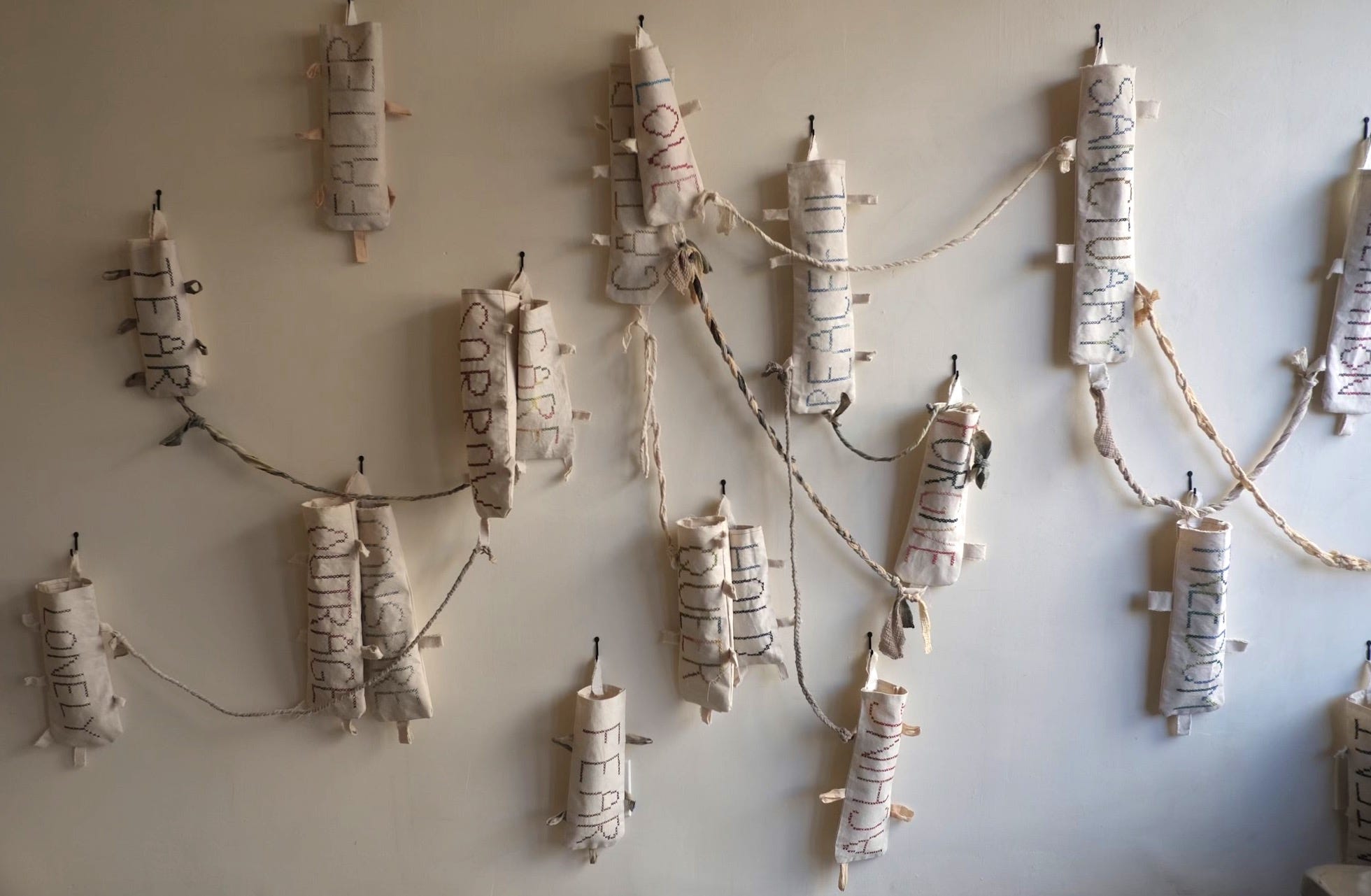 Freshly stitched text pages are brought to my home studio to be given backsides, becoming sacks or what Ursula Le Guin might call carrier bags, holding the narrative of seeds of stories. Returning to the annex they are hung from a set of randomly positioned hooks to be arranged and rearranged over the upcoming weeks as torn and twisted fibers are added, and poetic connections made visible.